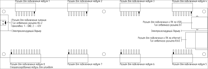 Блок содержит источник питания, плату ядра и платы модулей расширения. Соединительные провода для подключения к ПК и исполнительным устройствам выходят из блока через гермовводы.